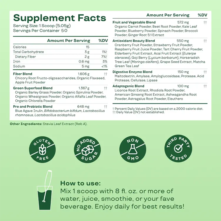 Bloom Greens and Superfoods 302,5 g (50 Serv) es una mezcla premium de superalimentos diseñada para impulsar tu energía diaria, mejorar la digestión y apoyar tu bienestar general. Con ingredientes verdes, probióticos y antioxidantes, ayuda a desinflamar, aumentar la vitalidad y mantener un sistema digestivo equilibrado. ¡Un delicioso impulso nutritivo que transforma tu rutina de salud desde el primer sorbo!