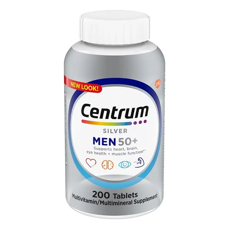 Centrum Silver Men 50+ 200 Tab es un multivitamínico diseñado para apoyar la energía, la inmunidad y la salud del corazón, huesos y vista en hombres adultos mayores de 50 años. Con vitaminas y minerales esenciales como D3, B12, zinc y luteína, te ayuda a mantener un bienestar integral con solo una tableta al día. ¡Ideal para seguir activo y sentirte mejor cada día!