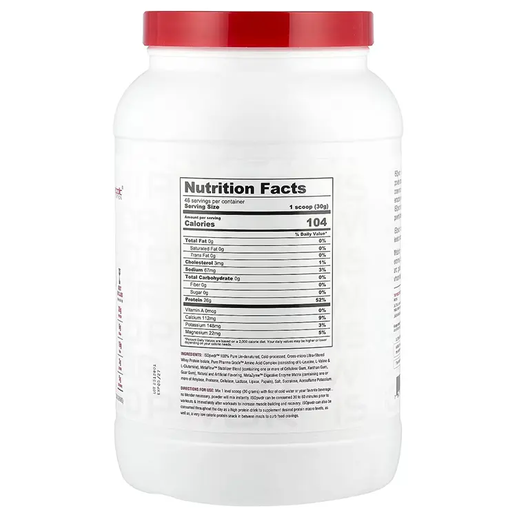 Iso Pwdr Sabores Varios 3.04 Lb 46 Serv de Metabolic es una proteína aislada de suero de leche de alta pureza, ideal para apoyar la recuperación y el desarrollo muscular después del entrenamiento. Su fórmula baja en carbohidratos y grasas se absorbe rápidamente, aportando los aminoácidos esenciales que tu cuerpo necesita para reparar y fortalecer el músculo.